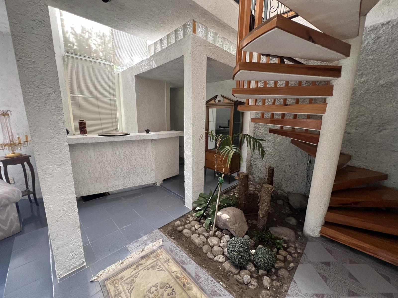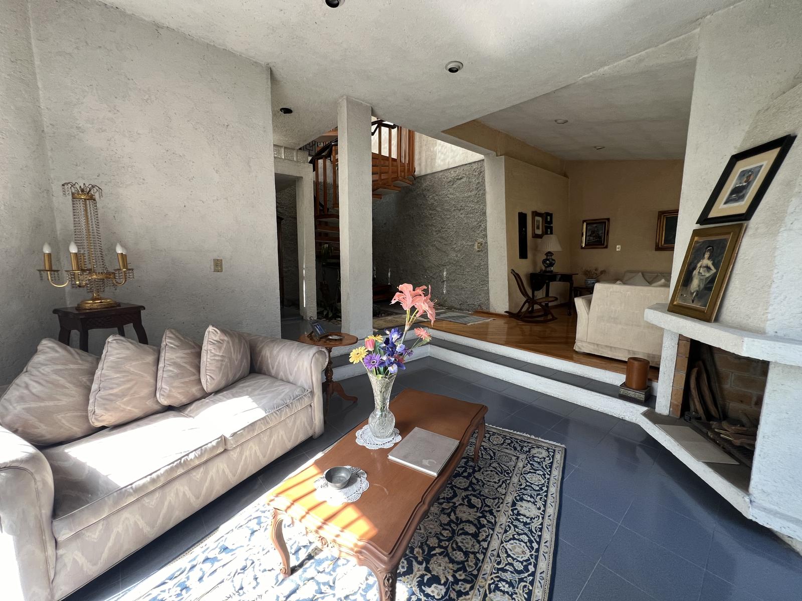 Desarrollada en 3 niveles comunicados con una hermosa escalera de caracol de madera, cuenta con 3 recámaras con baño cada una, la principal con vestidor, gran sala de estar, bonito y amplio vestíbulo con medio baño de visitas, 2 salas con chimenea y área de bar, comedor, cocina integral con desayunador, área de lavado y de servicio con recamara y baño, bodega y área de tendido.