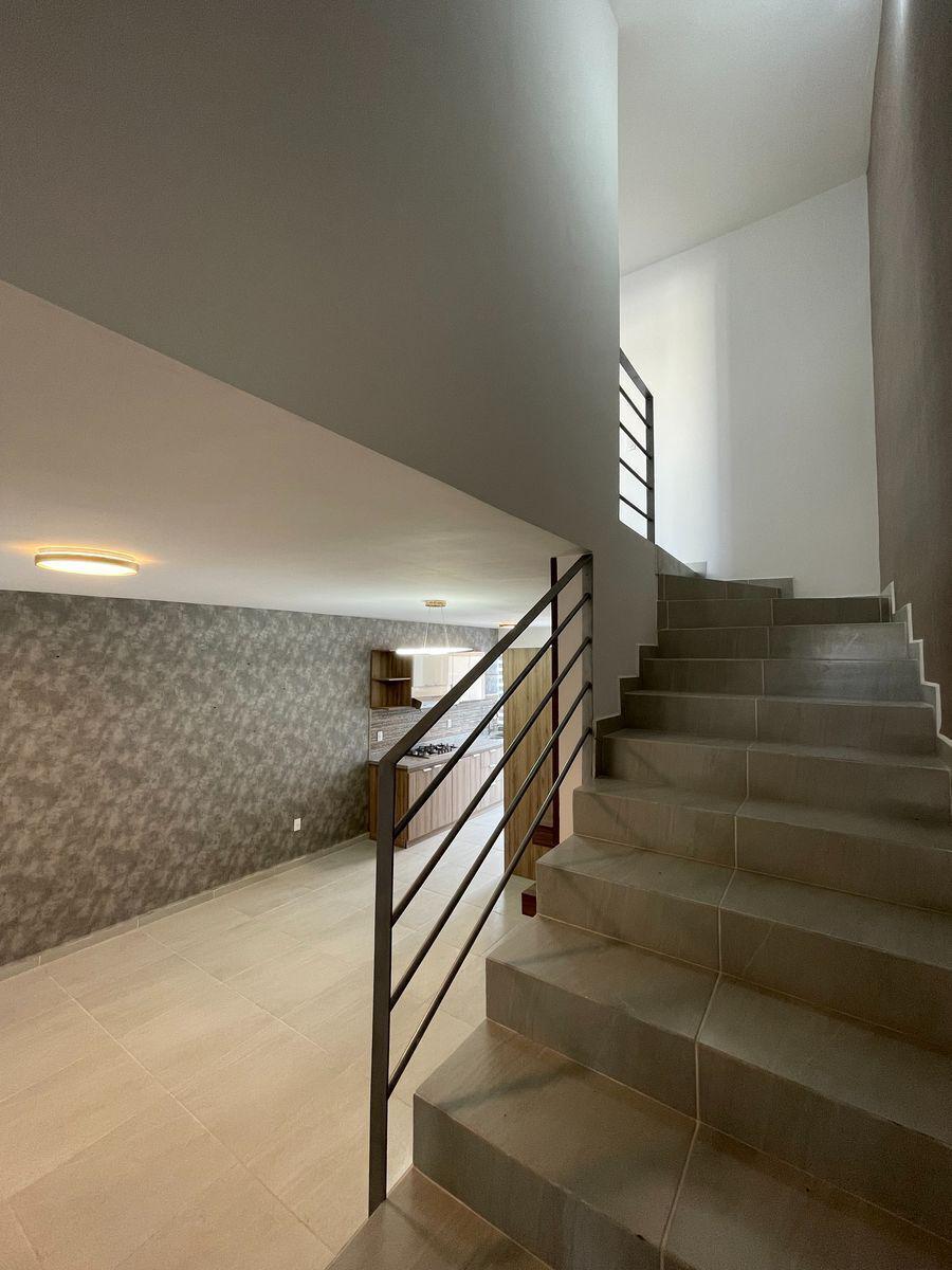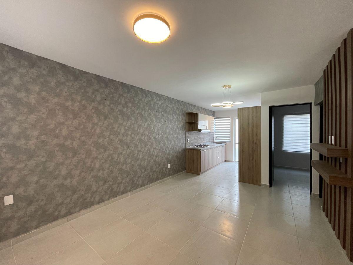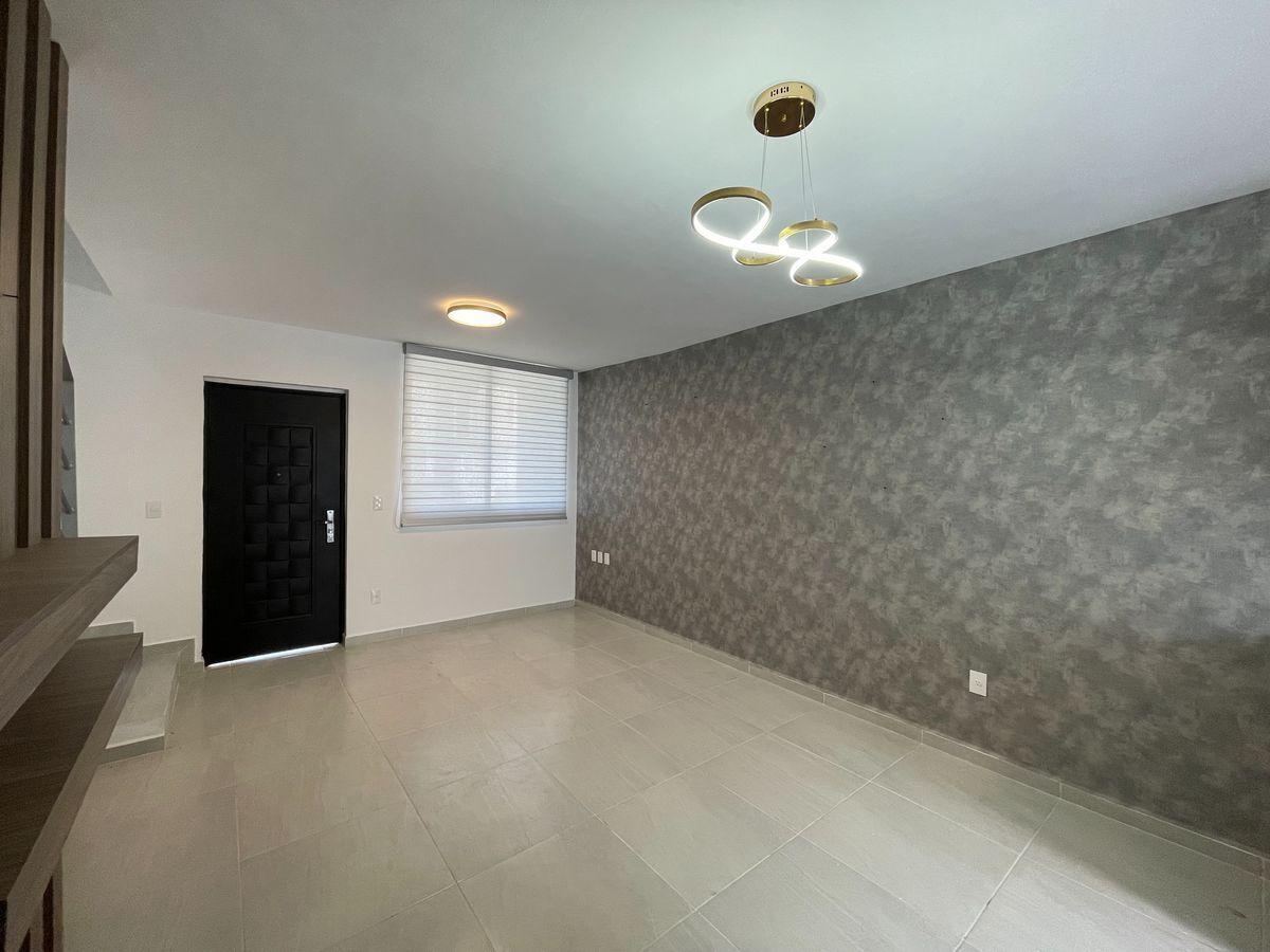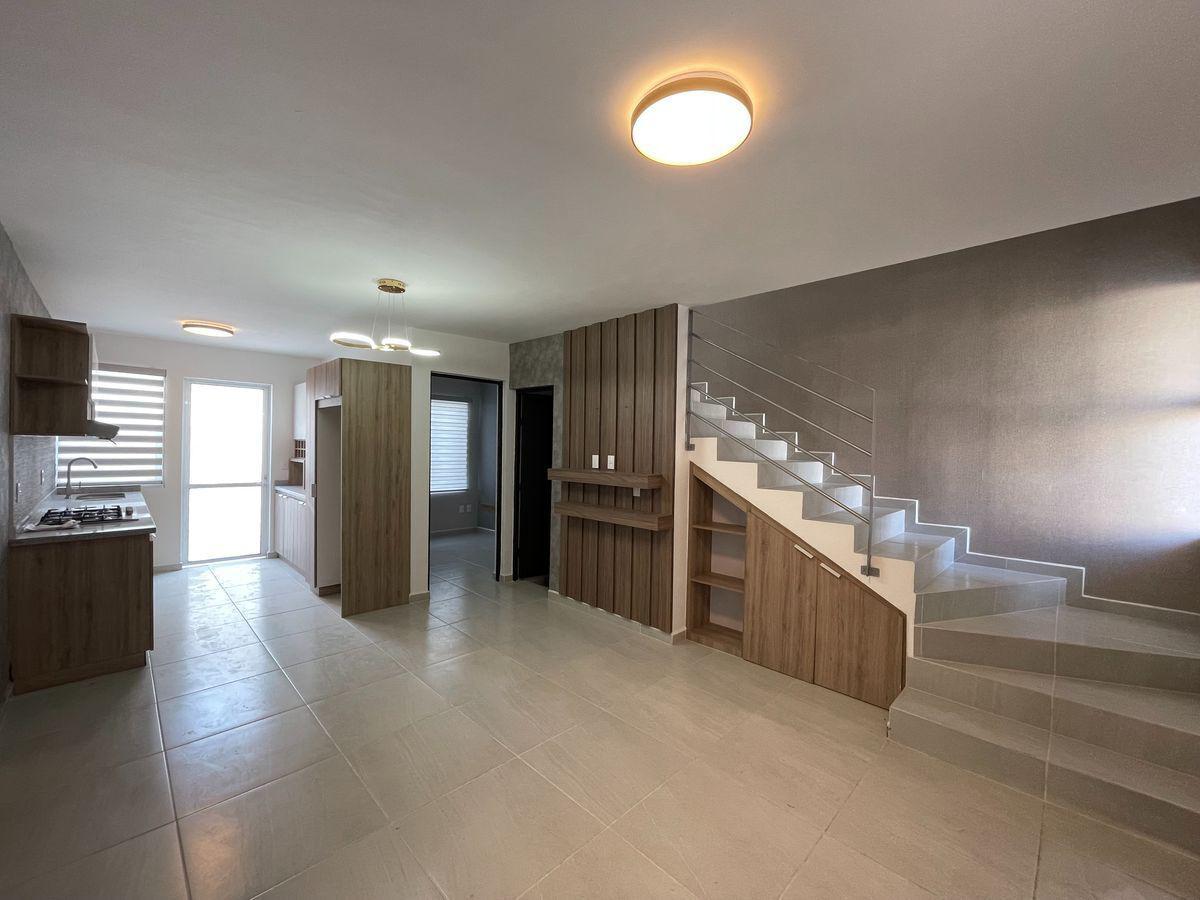 Amplia sala y comedor, cocina integral en bitono, cuarto de estudio con mueble, baño completo para servicio del área social, patio de lavado y jardín con salida hacia la parte frontal de la casa.